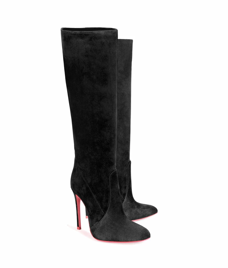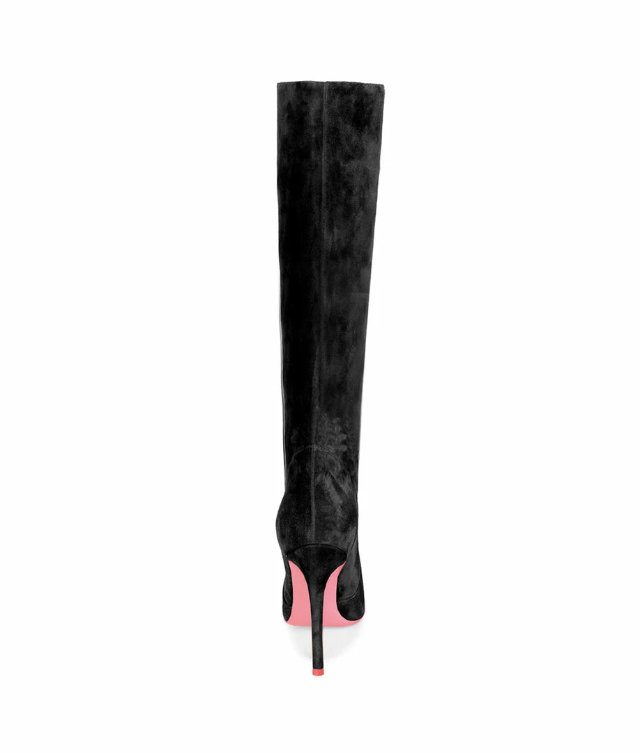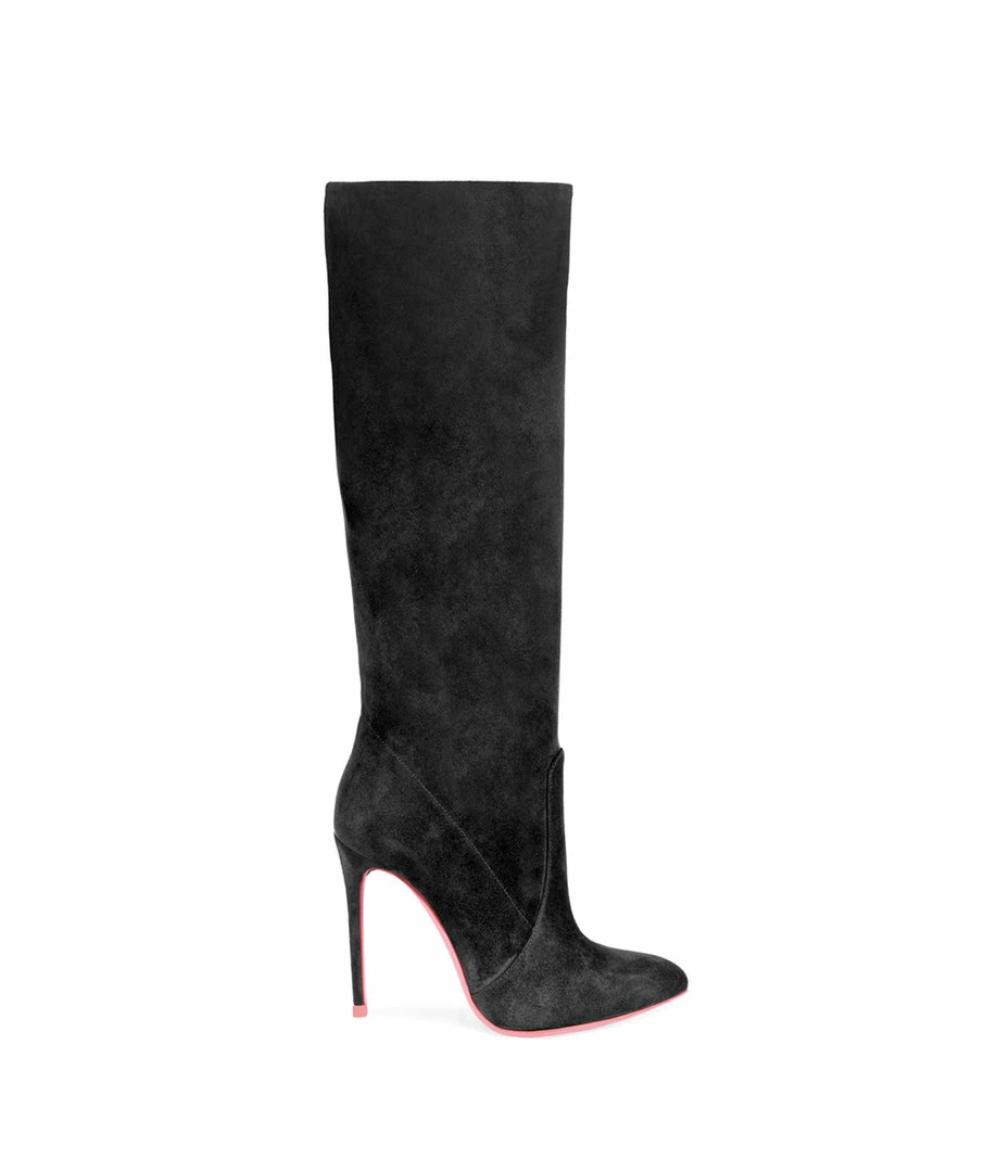 Adhil Black Suede · Round toe knee high boots made in soft suede leather the pin heel made these boots a touch of elegance and femininity and their 11cm height of heel made these boots perfect for everyday and every outfit.