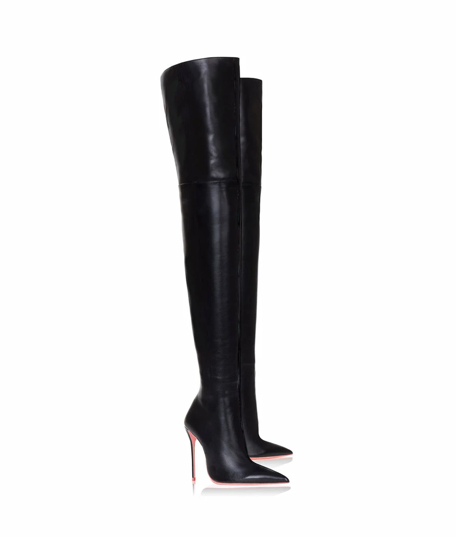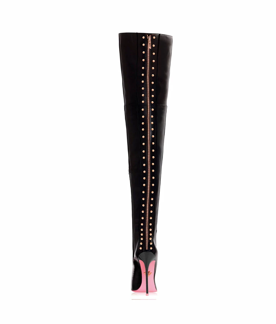 Algol Black · Extreme Long Boots made of soft black leather · These very high boots cover your entire legs and with their unique functional back zipper and back spikes with the possibility of choosing the color of the zipper and studs (silver, gold, rose gold or black) you can customize your boots and get a unique model. Absolutely one of the sexiest boots.