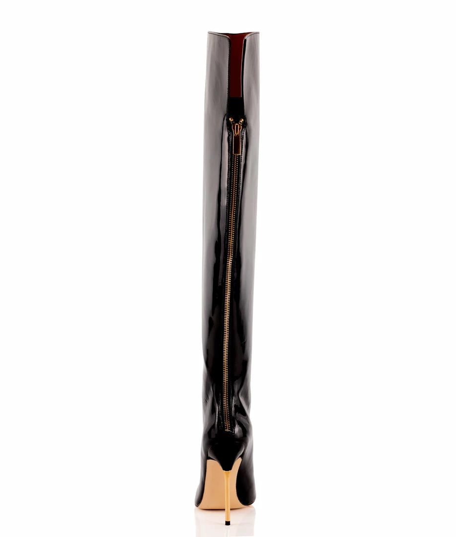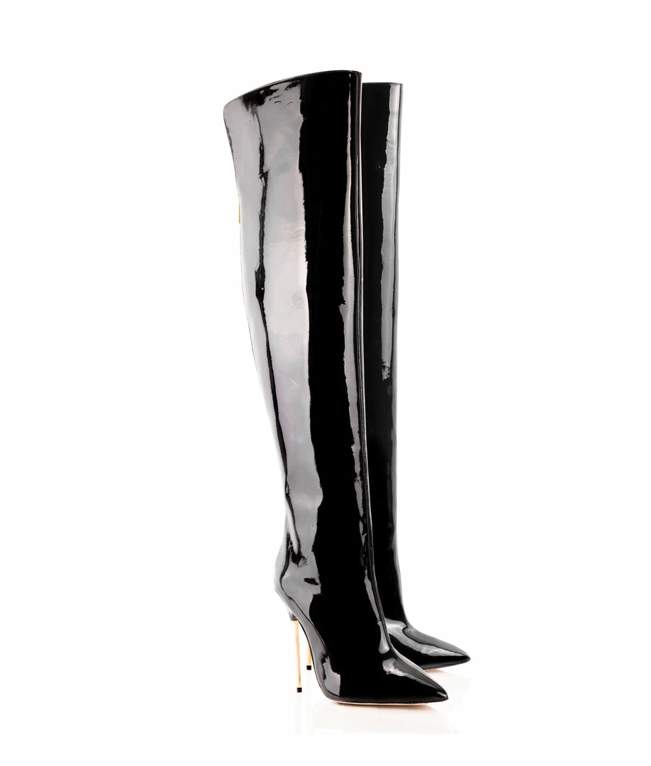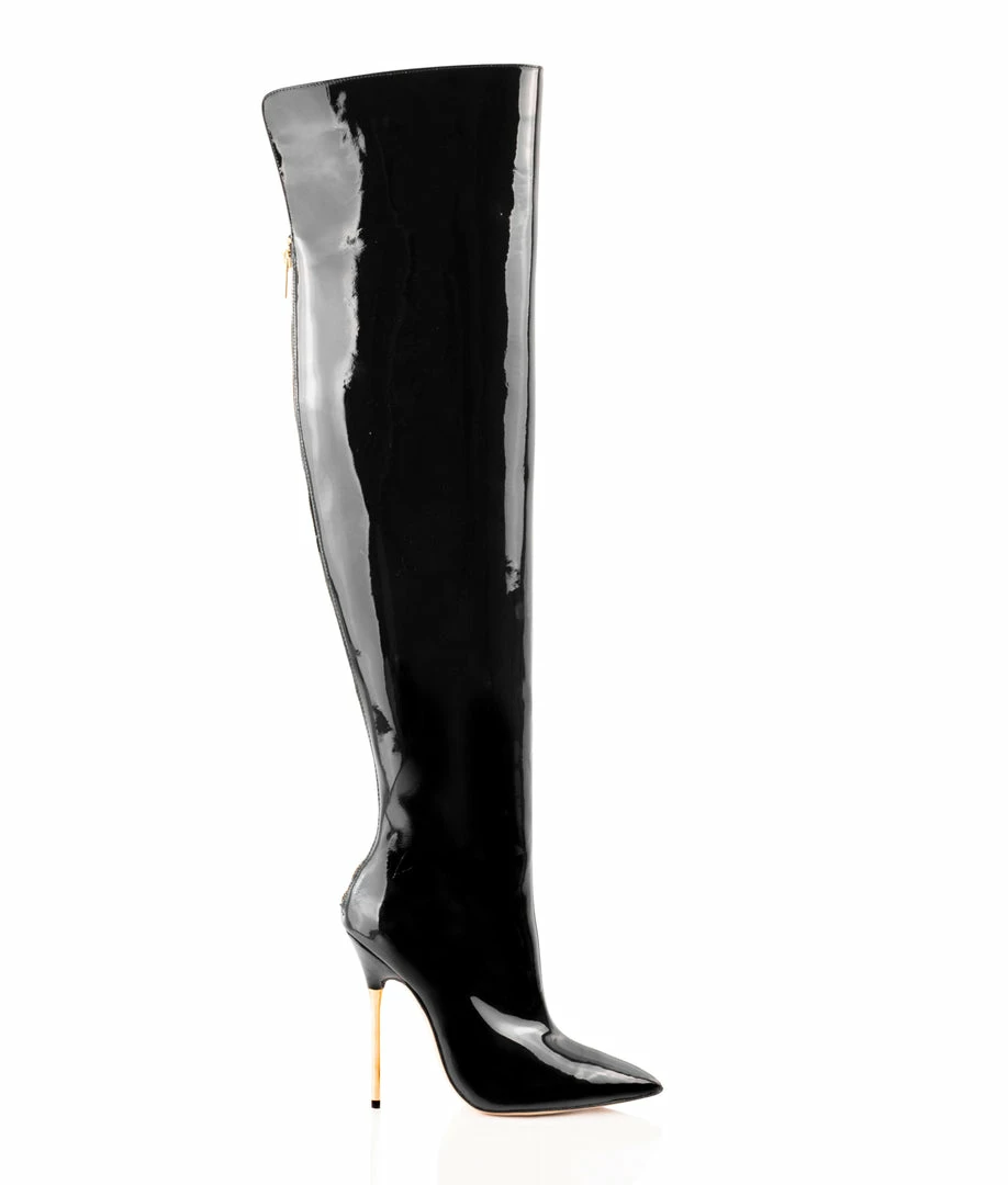 Dania Black Patent 105 · Pure genuine leather boots made to worship. This pair of thigh high boots is designed with metallic high heel in gold color and a pronounced foot arch. Captivating design perfect for your most seductive looks. Design manufactured in Italy by experts artisans. Long elegant pointed toe. Maybe Do You want customize them..Ask us