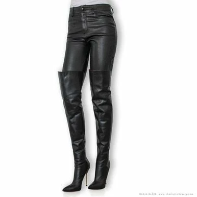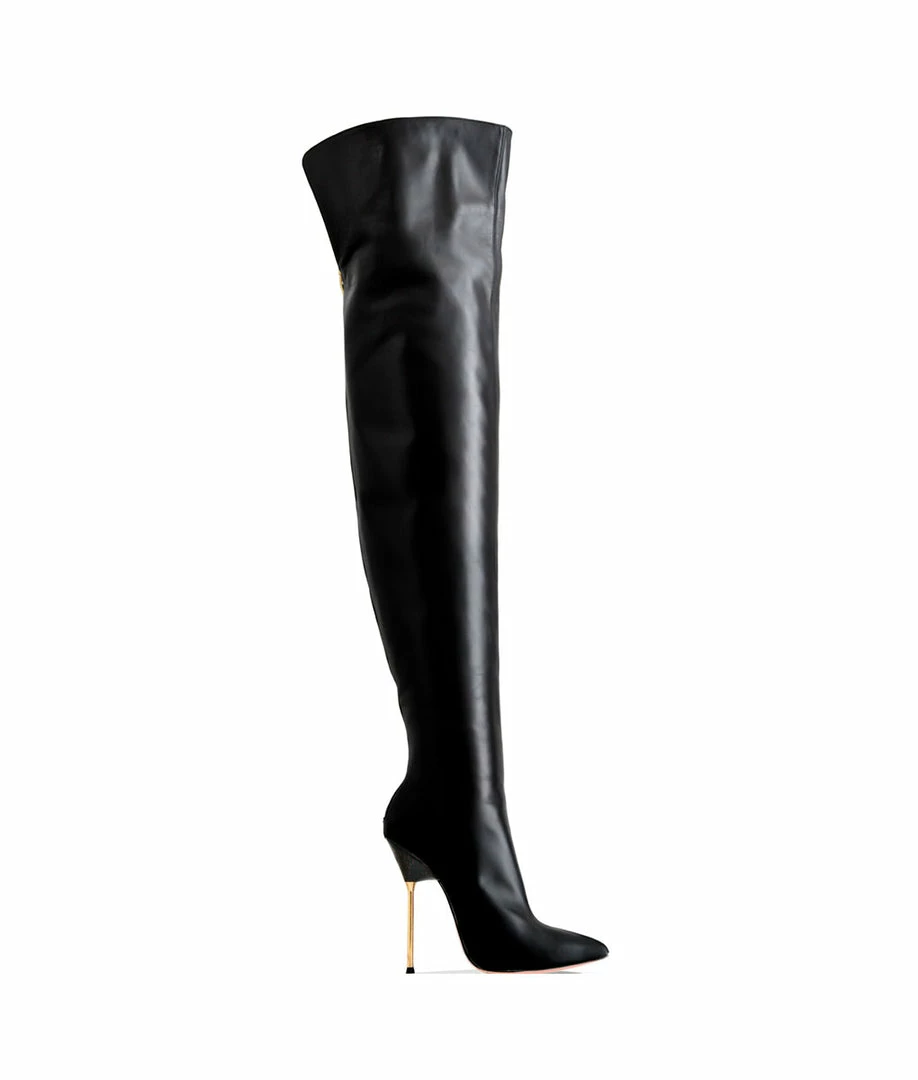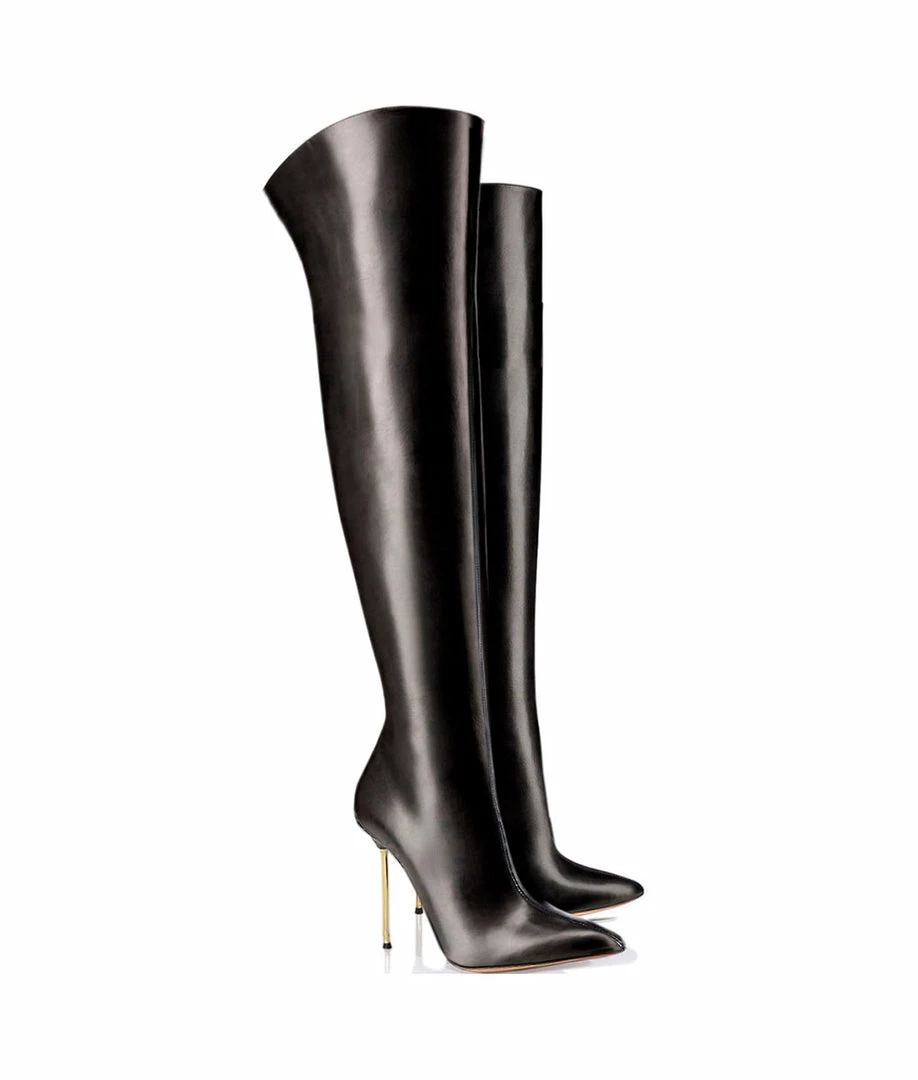 Dania Black · Pure genuine leather boots made to worship. This pair of thigh high boots is designed with metallic high heel in gold color and a pronounced foot arch. Captivating design perfect for your most seductive looks. Design manufactured in Italy by experts artisans. 100% Italy design. Extra Long elegant pointed toe