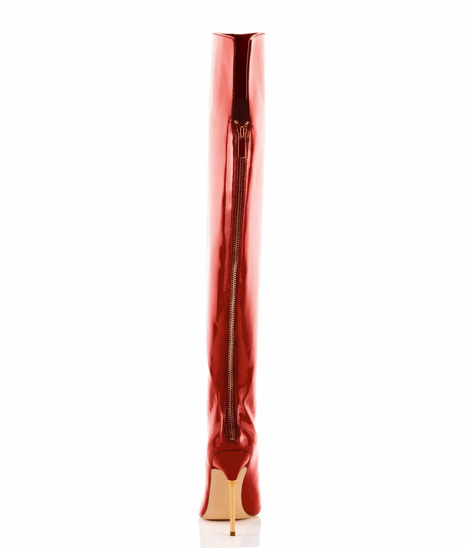 Dania Red Patent 105 · Pure genuine leather boots made to worship. This pair of thigh high boots is designed with metallic high heel in gold color and a pronounced foot arch. Captivating design perfect for your most seductive looks. Design manufactured in Italy by experts artisans. Long elegant pointed toe. Maybe Do You want customize them..Ask us