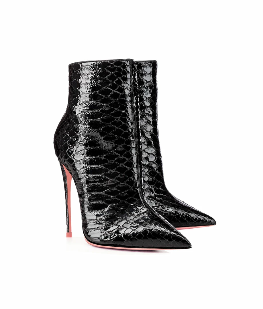 Denex Black Python · Fabulous classic high heel booties made in genuine python patent leather. These boots are made with our new heel, in search of the best design and get the sexy silhouette. You can resist them?