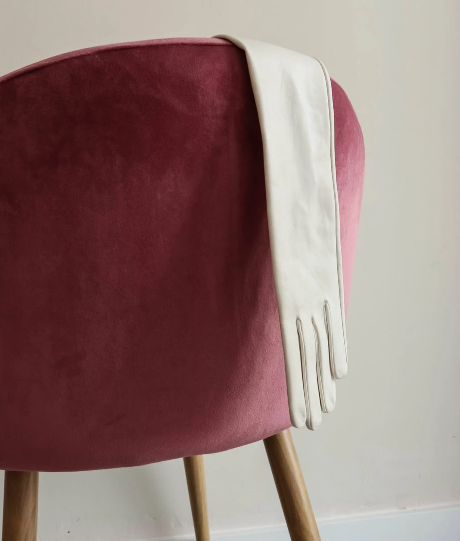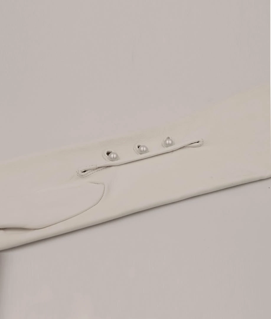 Odice White · Elegant opera gloves in soft leather and fine finishes. An essential for your wardrobe. With three pearls on the wrist.