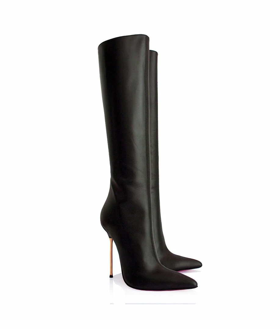 Kamya Black · Pointed toe Knee High Boots made in genuine leather . These sharp and long pointed toe made these boots and the zipper whole back the boots one touch special and sexys. Do you want these boots in other color?, Ask us