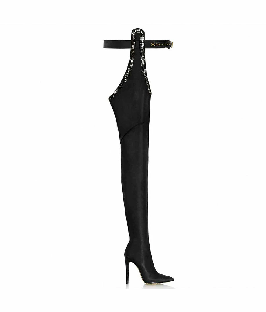Triana Black is a pair of high-heeled chap boots that are fastened with a belt at the waist. The ideal model for the days when you want your look to be the protagonist of the place.