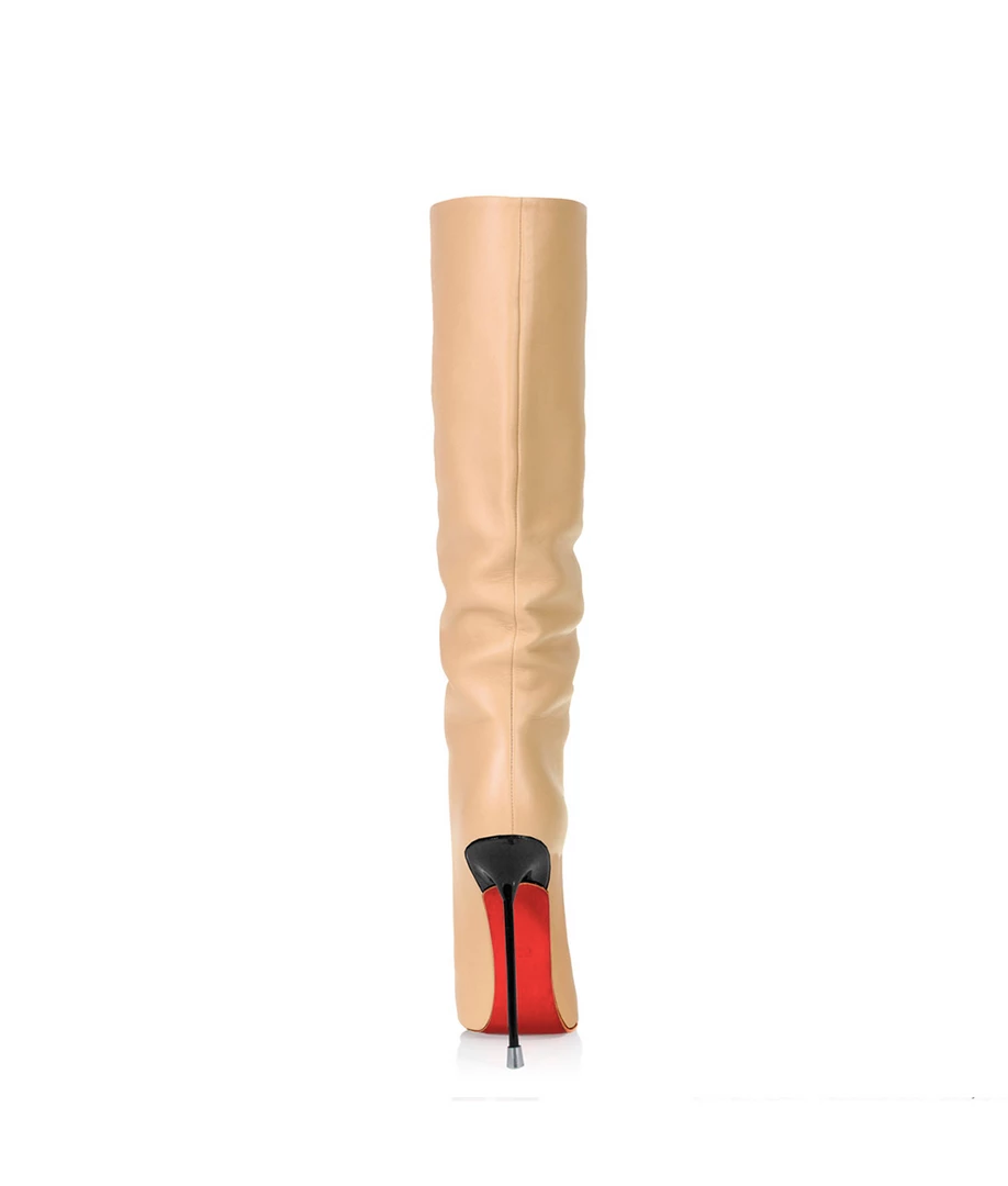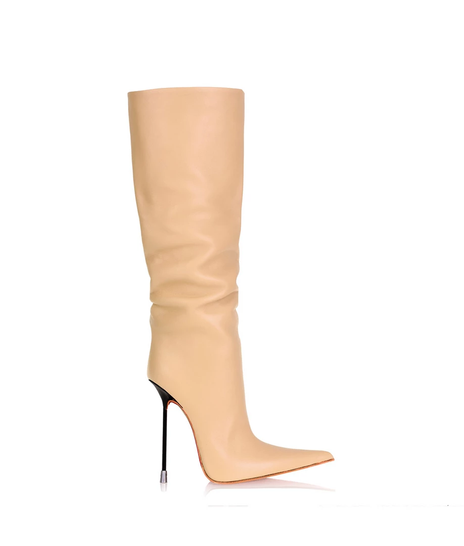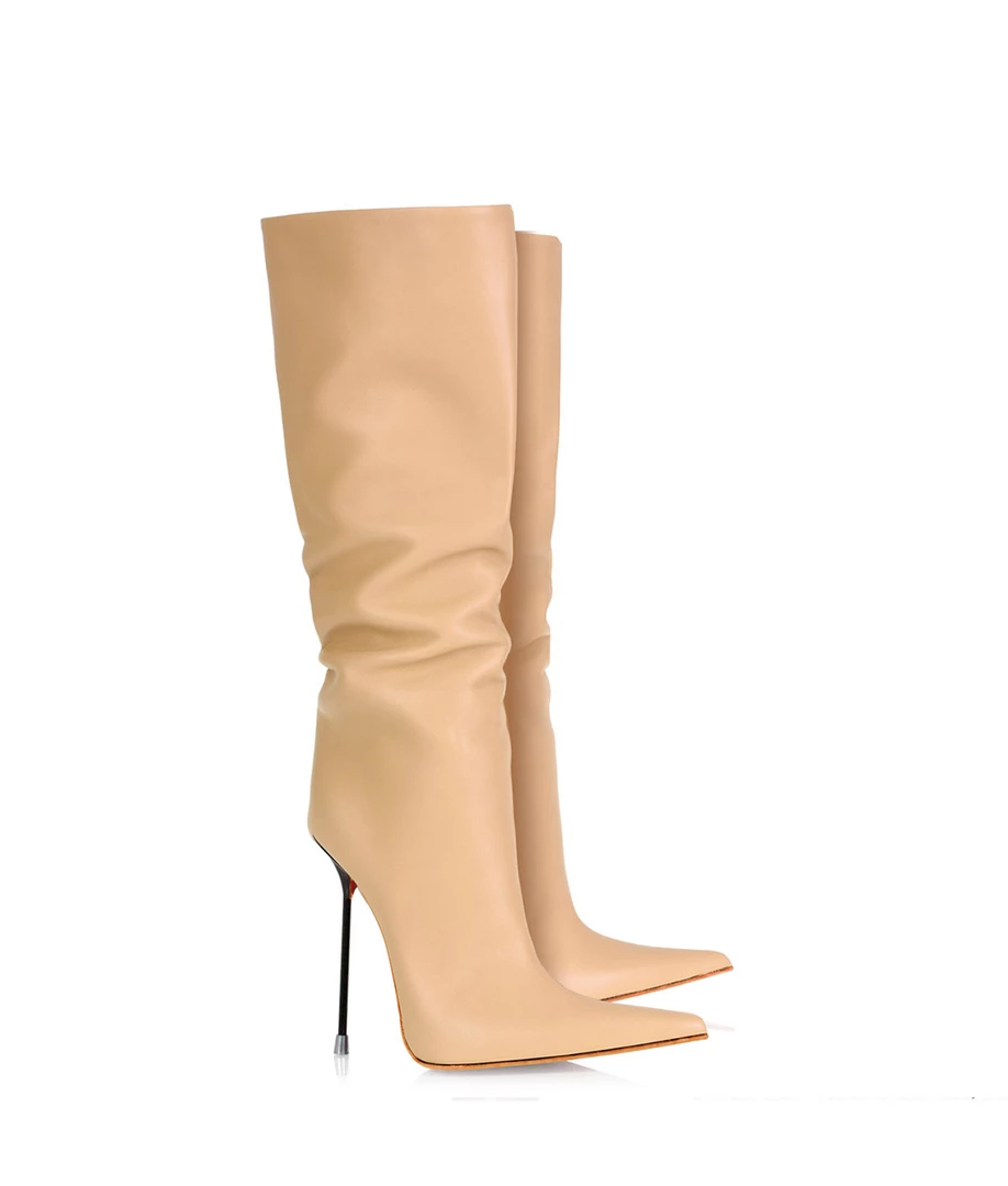 Byshian Nude · These tube boots are made in soft lambskin and that allows a fall of the leather that forms these beautiful wrinkles in this model. Its fine heel and its long tip make this model perfect to get this elegant outfit for a special occasion