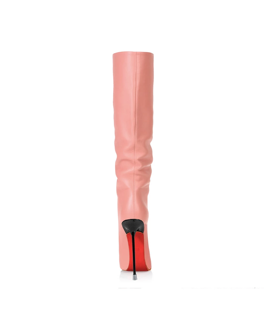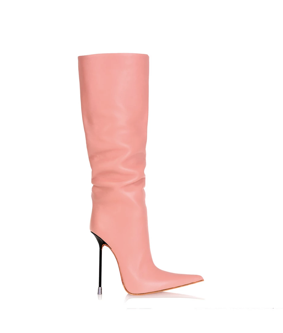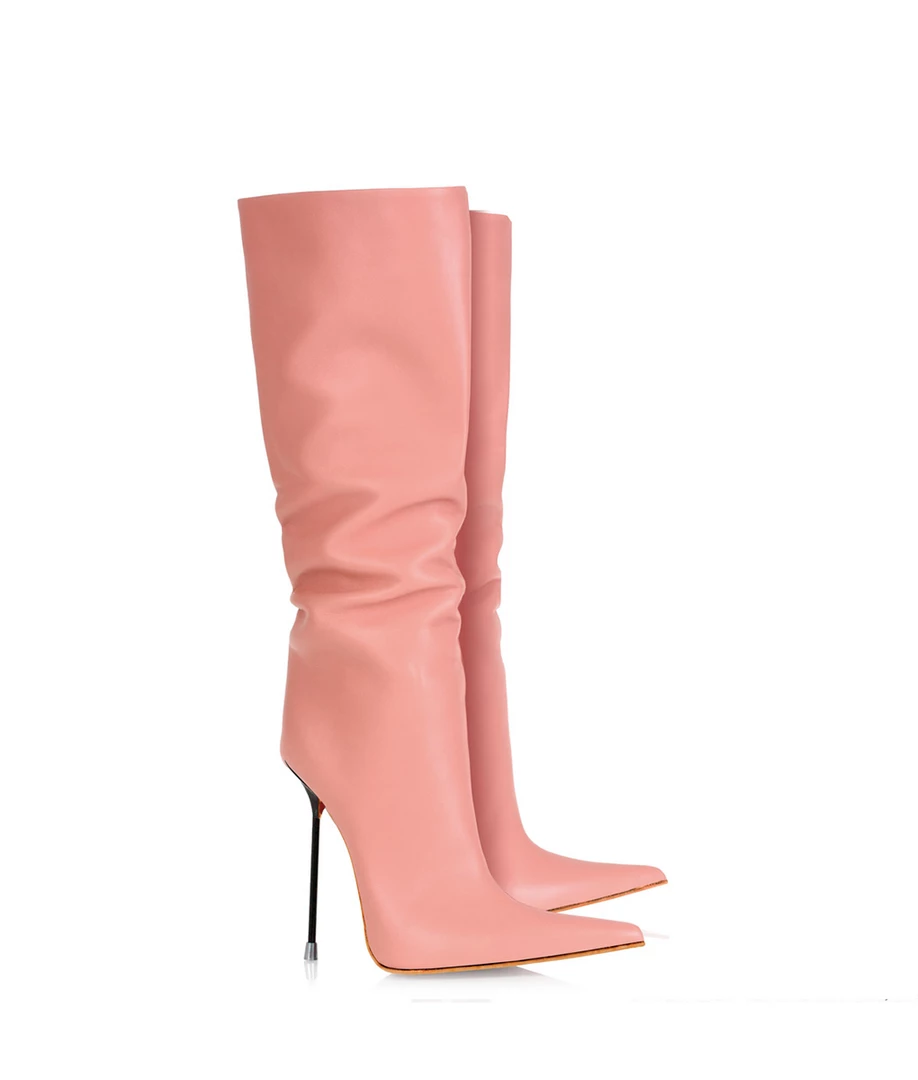 Byshian Pink · These tube boots are made in soft lambskin and that allows a fall of the leather that forms these beautiful wrinkles in this model. Its fine heel and its long tip make this model perfect to get this elegant outfit for a special occasion