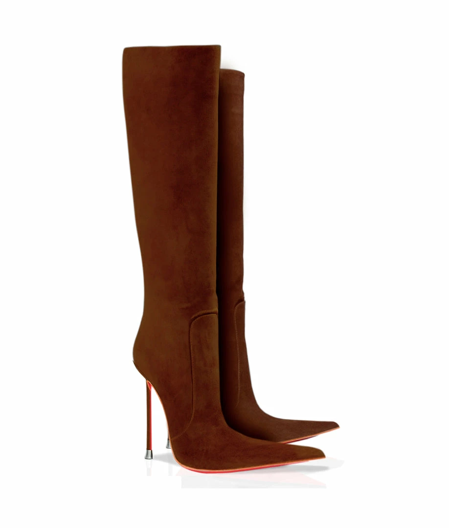 Corçao London Tan Suede Knee boots are crafted from genuine leather. Exclusive boots with full personality, sure you will not be able to stop looking at them! This high pair of boots is designed with a thin stiletto heel and a long pointed tip. These boots are made exclusively for each customer and let your own customization. You are unique an special, your boots too