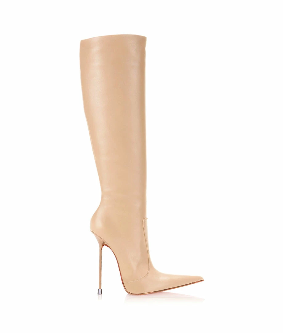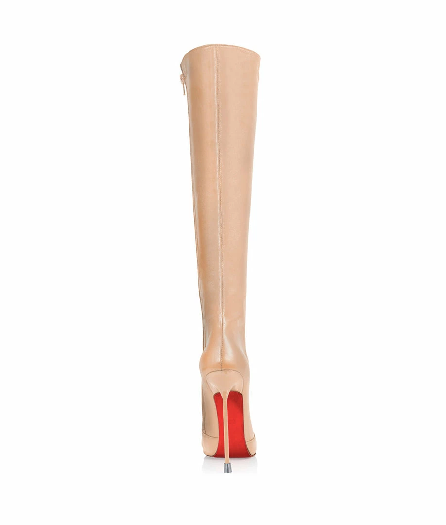 Corçao Nude Knee boots are crafted from genuine leather. Exclusive boots with full personality, sure you will not be able to stop looking at them! This high pair of boots is designed with a thin stiletto heel and a long pointed tip. These boots are made exclusively for each customer and let your own customization. You are unique an special, your boots too