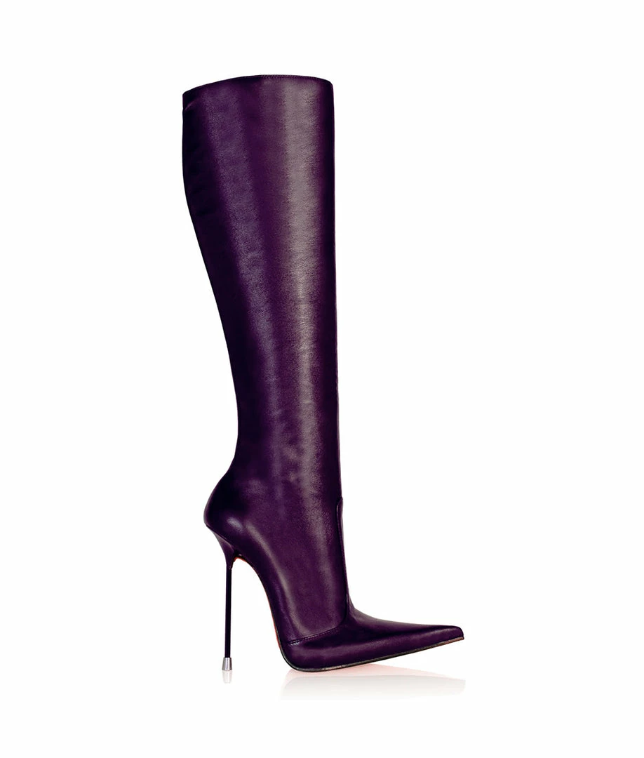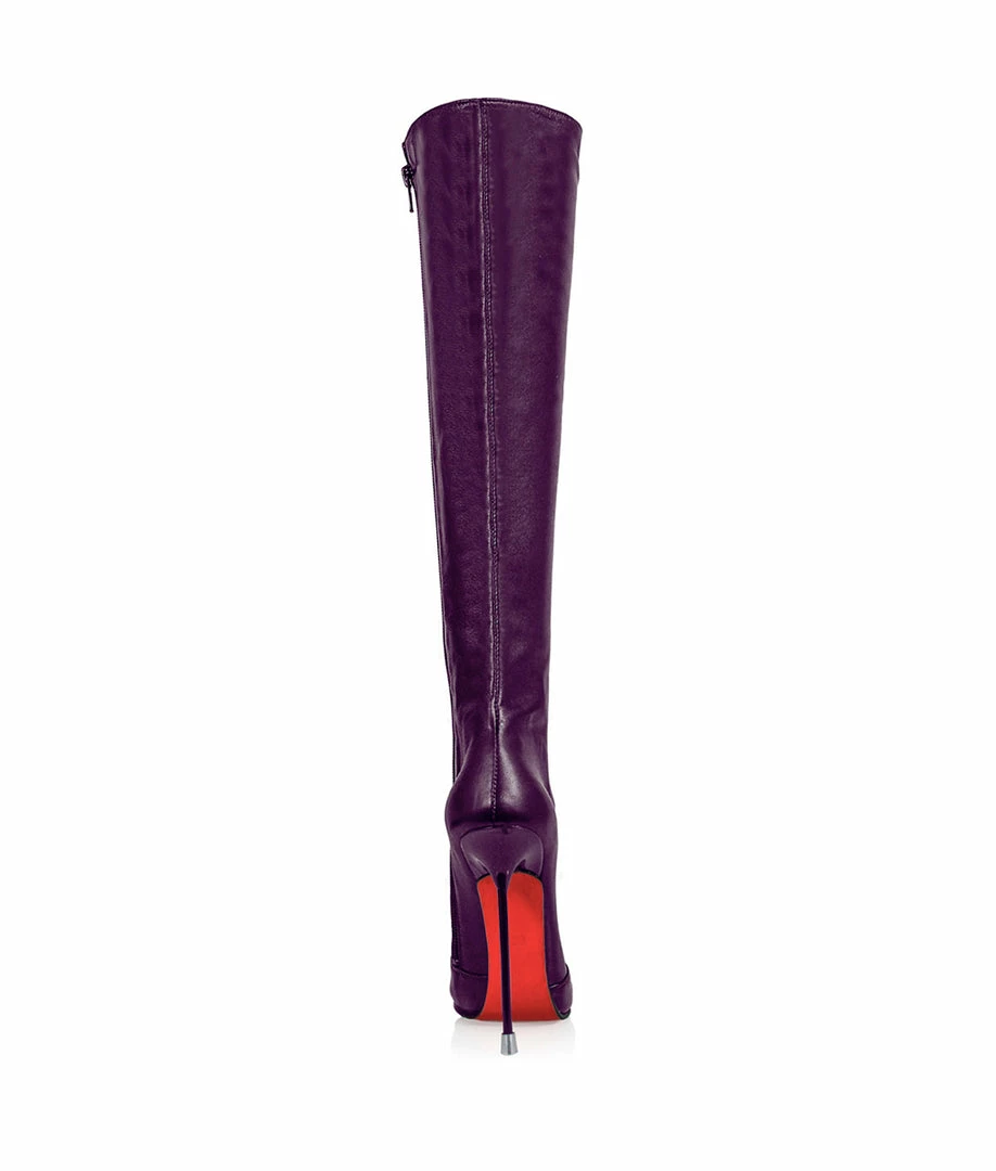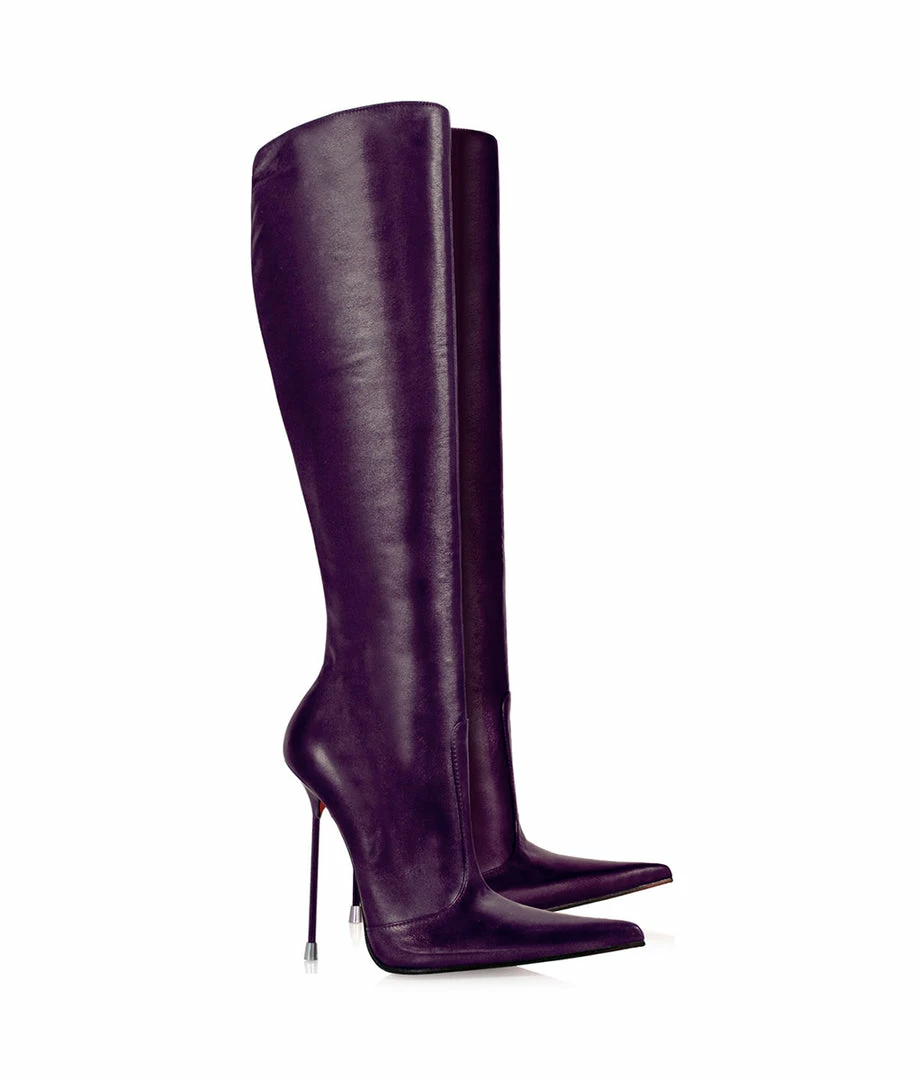 Corçao Purple Knee boots are crafted from genuine leather. Exclusive boots with full personality, sure you will not be able to stop looking at them! This high pair of boots is designed with a thin stiletto heel and a long pointed tip. These boots are made exclusively for each customer and let your own customization. You are unique an special, your boots too