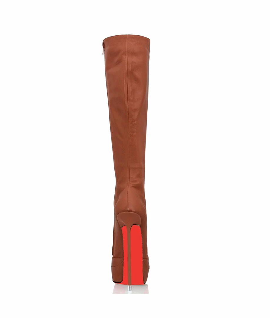 Demona Chocolate Knee boots are crafted from genuine leather. Knee boots with elegant and versatile style. These boots are made exclusively for each customer so You can choose your favorite custom for them. Choose the sole and inside color and if you prefer the heel leather covered or not. This pair of platform boots is designed with perfect finishes, visible platform and thin stiletto heel.