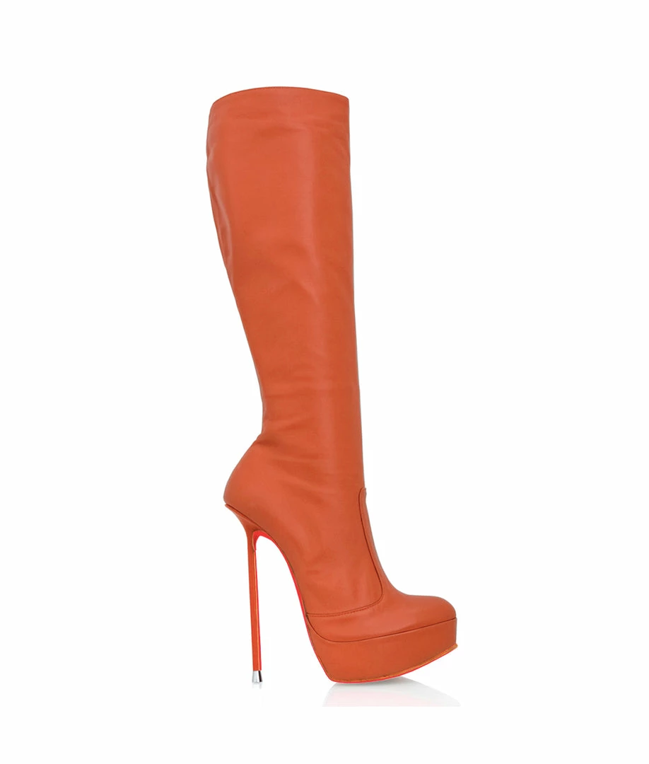 Demona English Tan Knee boots are crafted from genuine leather. Knee boots with elegant and versatile style. These boots are made exclusively for each customer so You can choose your favorite custom for them. Choose the sole and inside color and if you prefer the heel leather covered or not. This pair of platform boots is designed with perfect finishes, visible platform and thin stiletto heel.