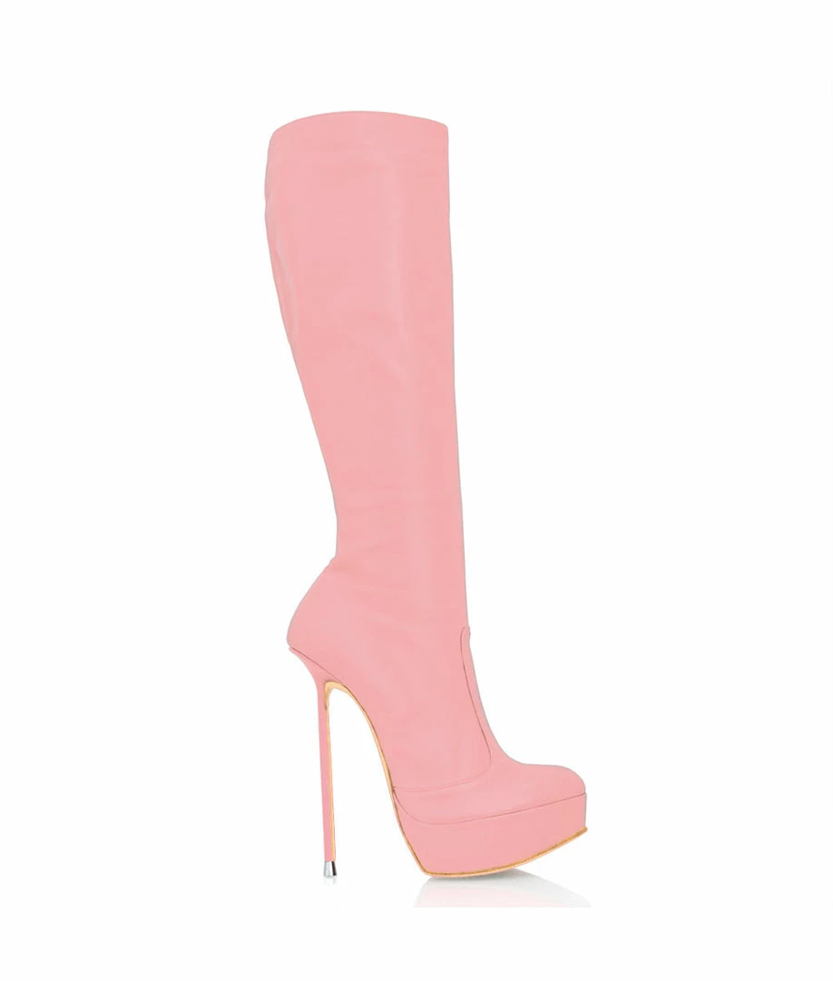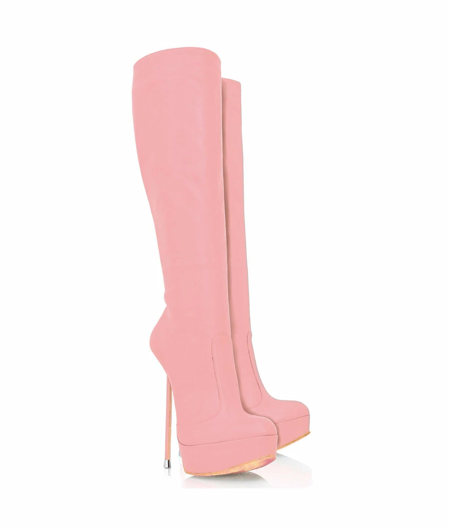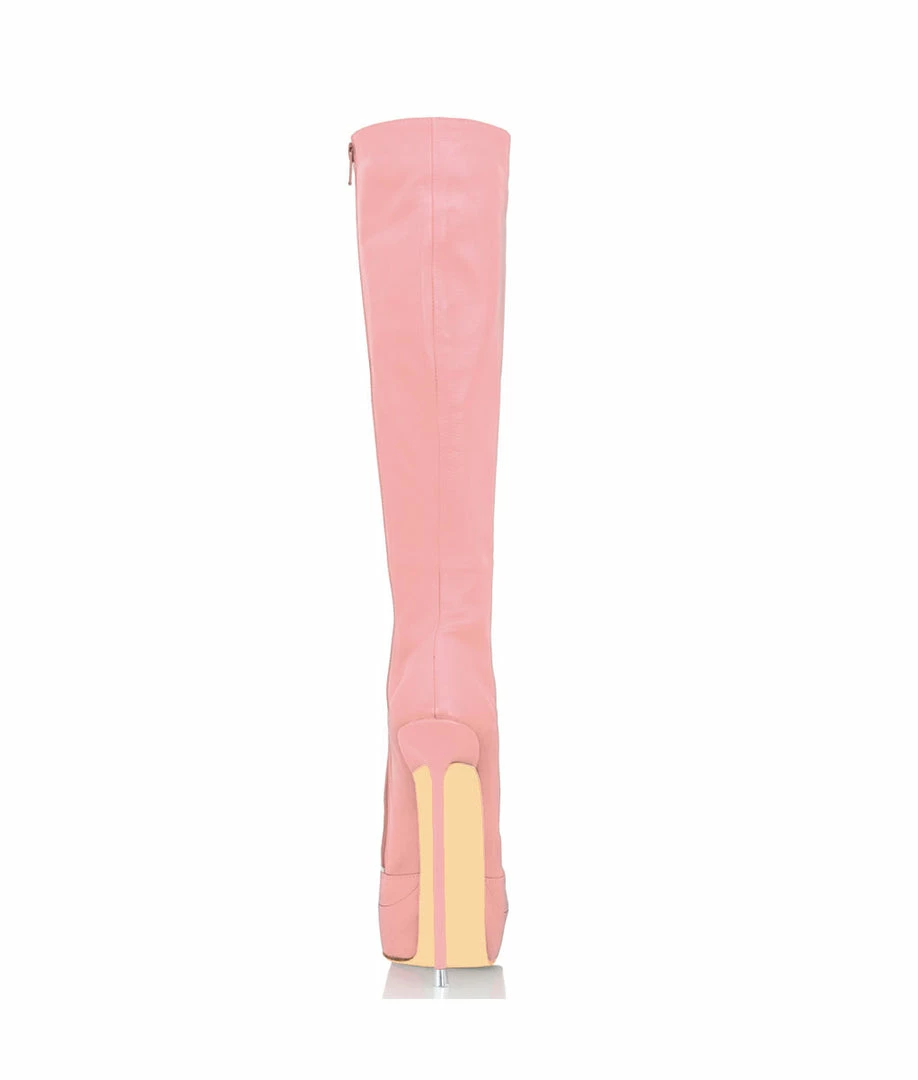 Demona Pink Knee boots are crafted from genuine leather. Knee boots with elegant and versatile style. These boots are made exclusively for each customer so You can choose your favorite custom for them. Choose the sole and inside color and if you prefer the heel leather covered or not. This pair of platform boots is designed with perfect finishes, visible platform and thin stiletto heel.