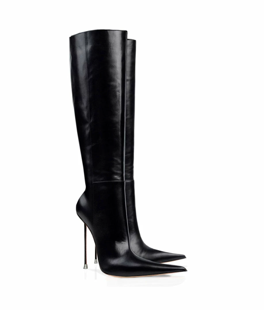 Kasiis Black Knee boots are crafted from genuine leather. Exclusive boots with full personality, sure you will not be able to stop looking at them! This high pair of boots is designed with a thin stiletto heel and a long pointed tip. These boots are made exclusively for each customer and let your own customization. You are unique an special, your boots too