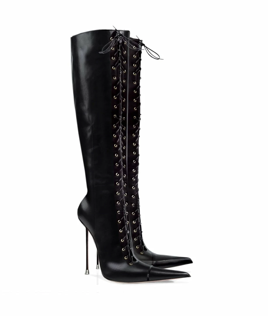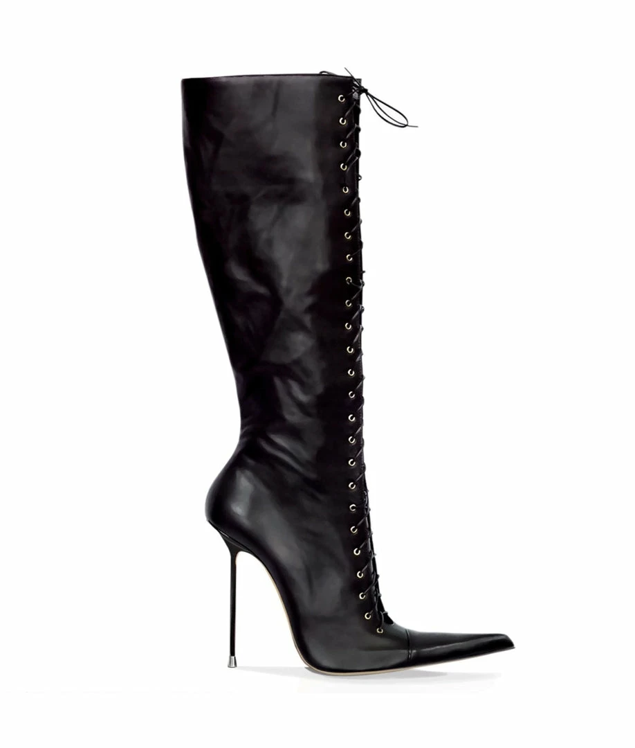Long toe, with extra fine stiletto heel and lacing throughout the front of the boot. A bold and stylish design perfect to highlight any look. Wrap yourself between desire and sensuality at every step you take.