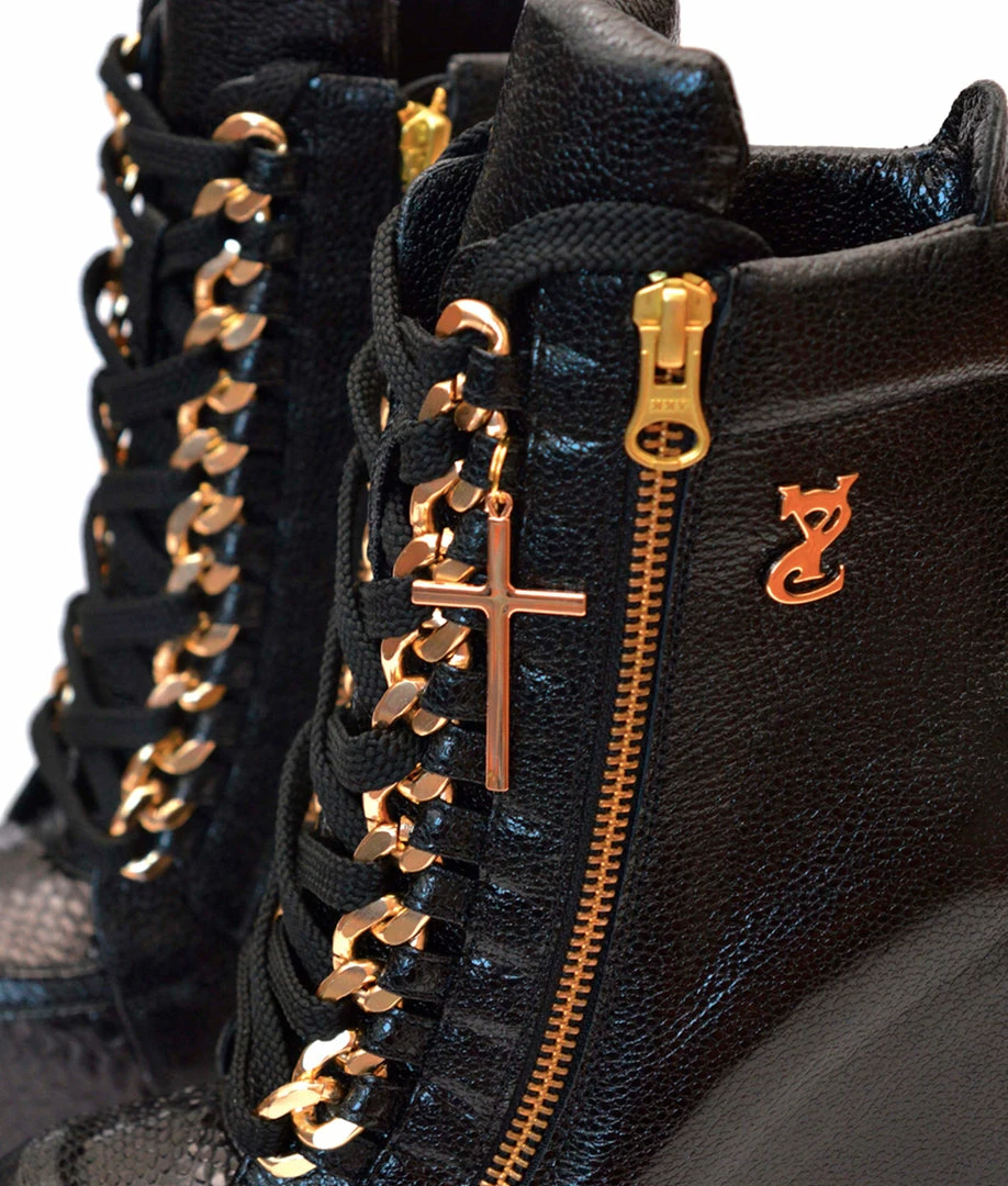 Cocura Black – Stylish wedge sneakers full of detail. Crafted from genuine leather & real python. This pair of wedges is designed with lace up at front embellished with a golden chain. This design is ready to accompany you and