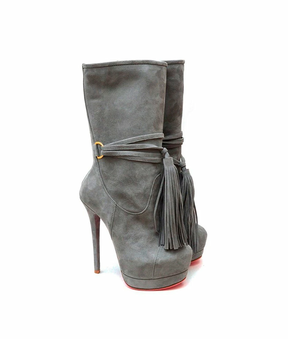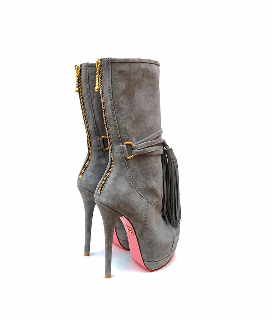 Dalia Gray · These booties crafted from suede leather in gray color. This model is design with two tassels on the front and a zipper in the rear aprte that makes this model with a different personality. Custom these lovely booties custom made.