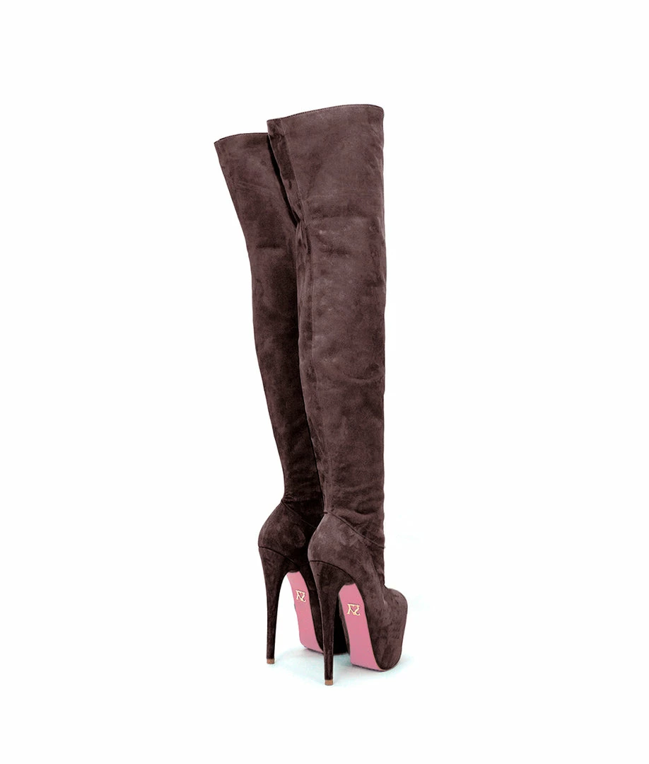 Dinda Brown , a magnificent design of thigh boots crafted from smooth suede in brown color. This pair of heeled boots is made with covered platform and with possibility to choose height of heel and sole color.