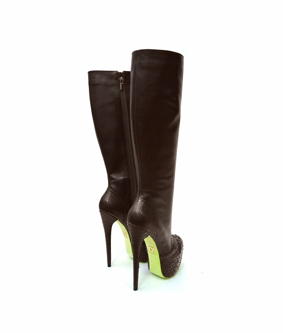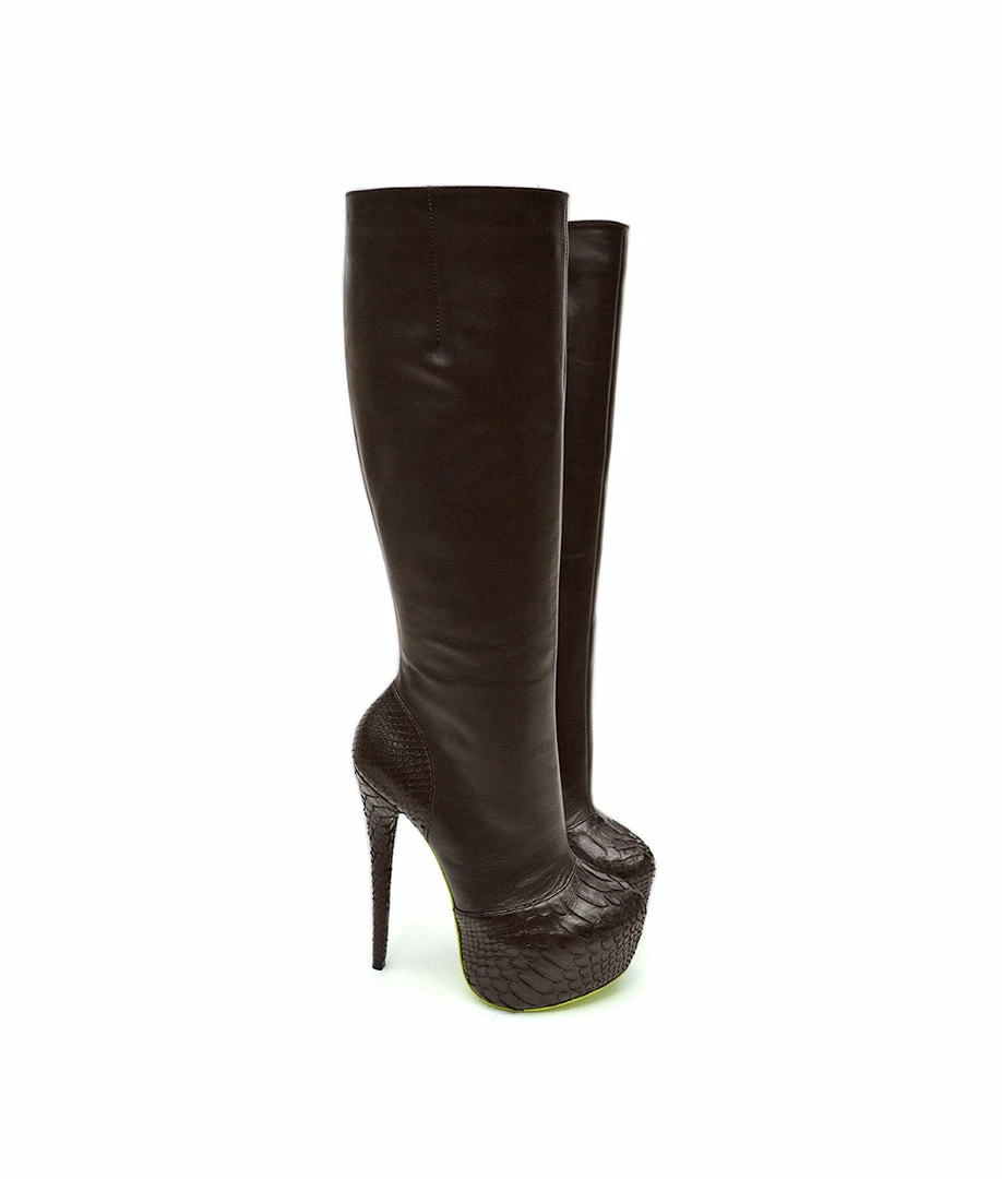 Hostalia Brown Python – Platform knee high boots with a very high heel. Its design combines python skin, at the toe and heel, with smooth leather. Choose the height or color of the sole you prefer.