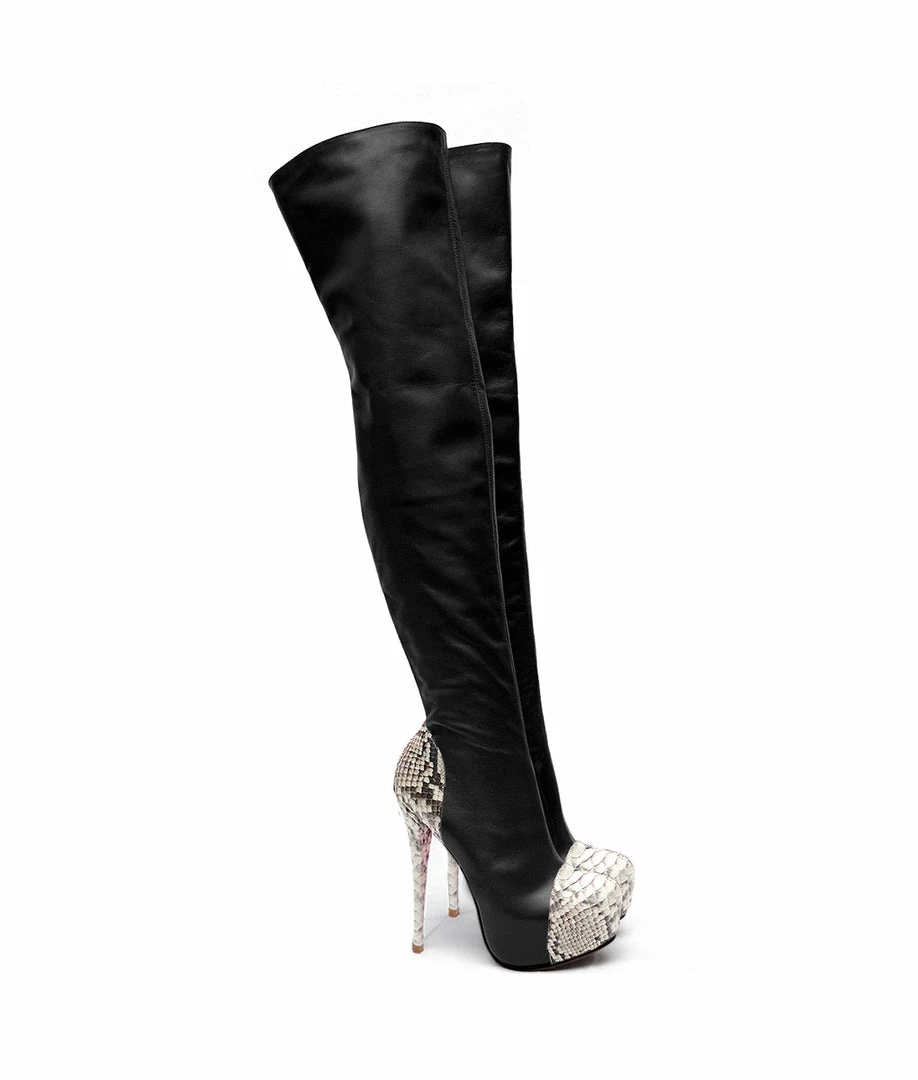 Husky Black & Gray – Platform Thigh high boots with a very high heel and strech leather. Its design combines python skin, at the toe and heel, with smooth leather. Choose the height or color of the sole you prefer.