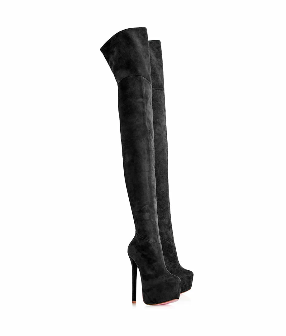 Kharim Black Suede – Platform thigh high boots with a very high heel. Its design has a small side zipper. Choose the height or color of the sole you prefer.