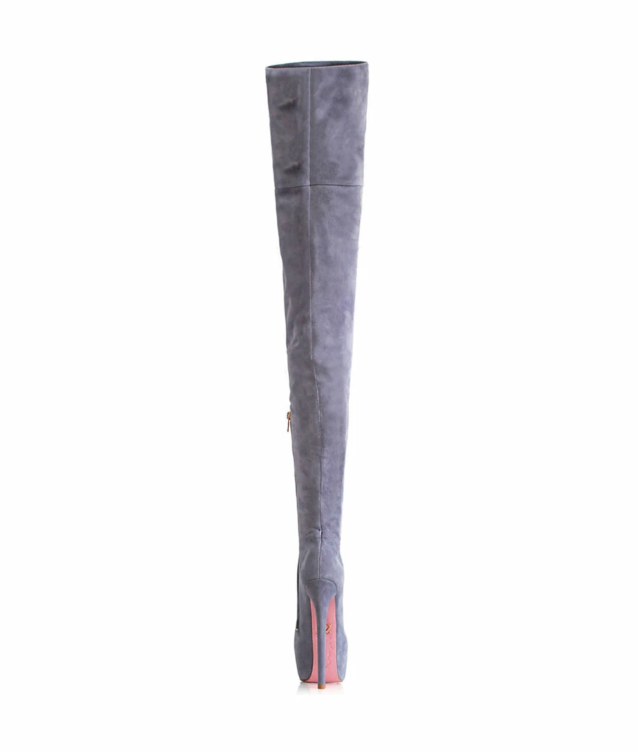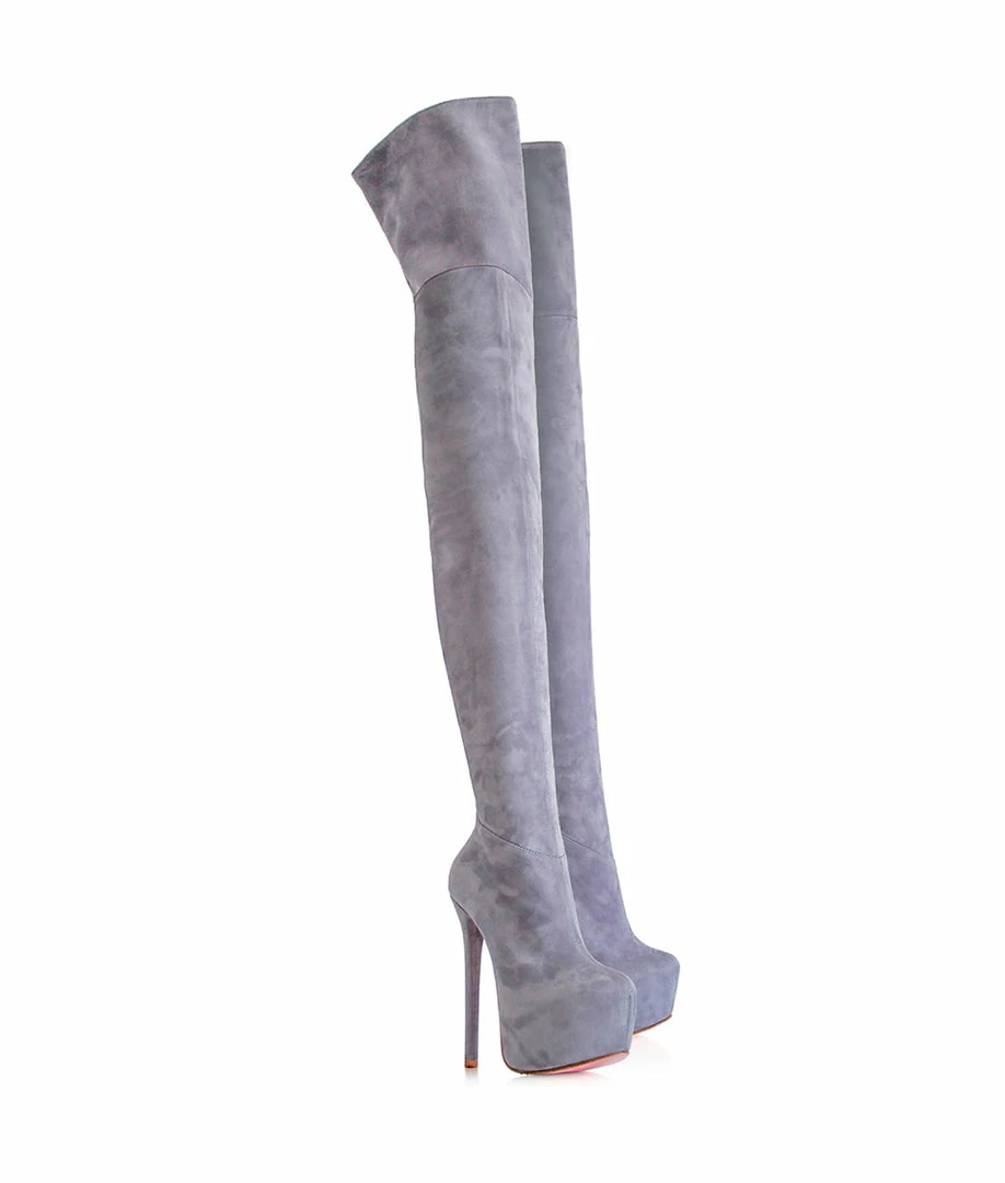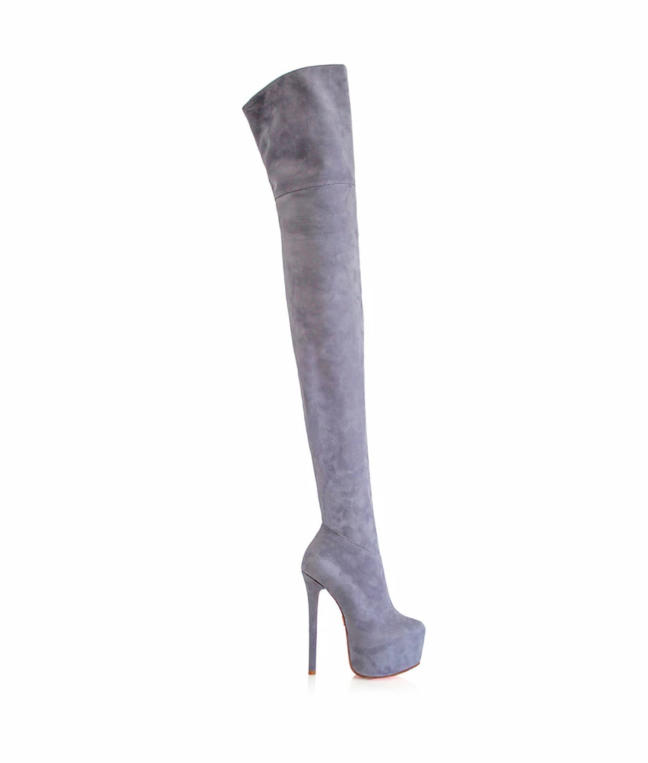 Kharim Gray Suede – Platform thigh high boots with a very high heel. Its design has a small side zipper. Choose the height or color of the sole you prefer.