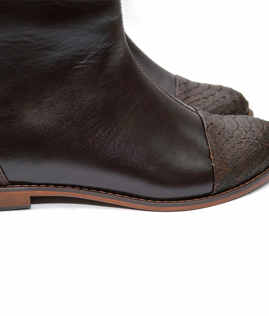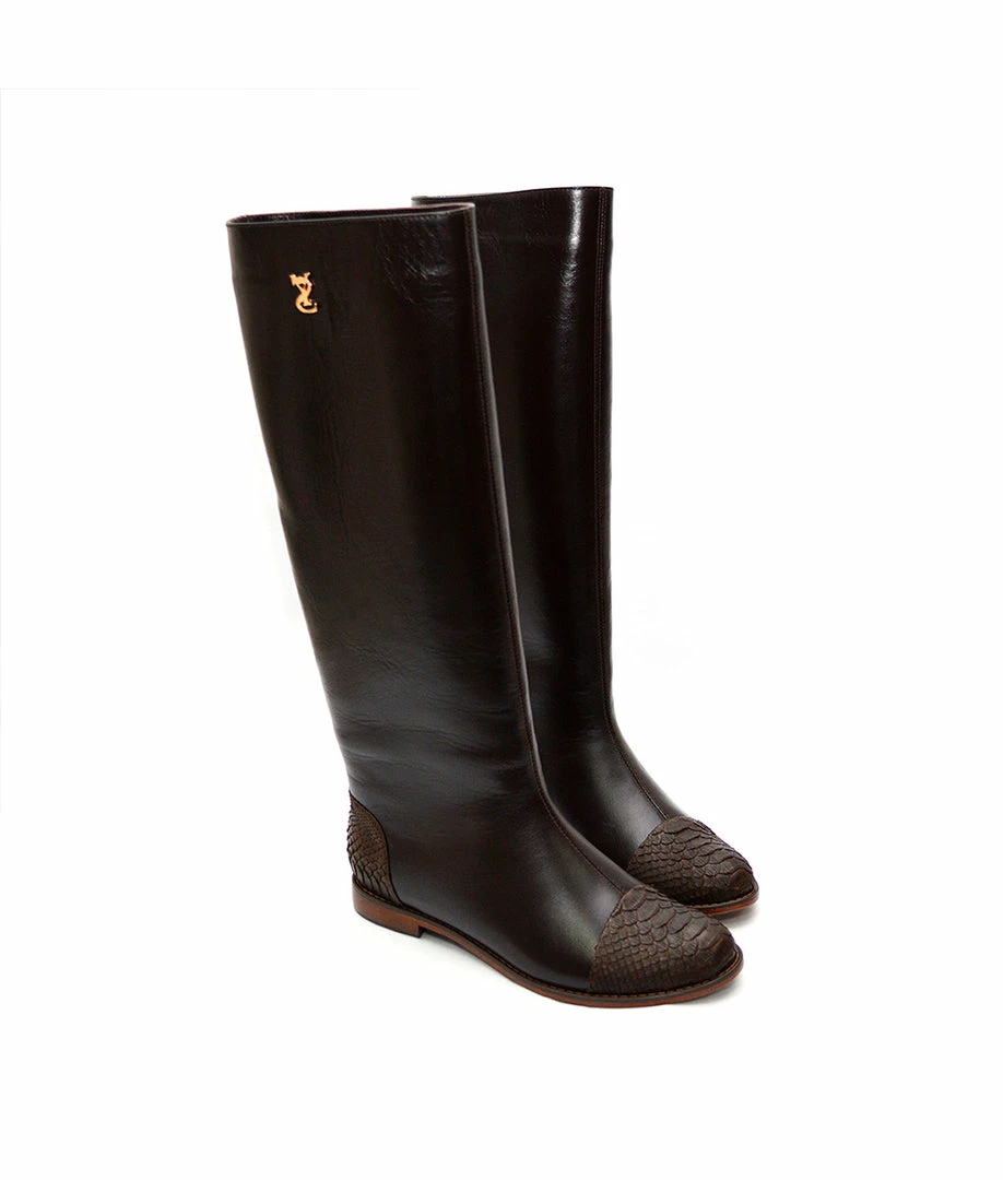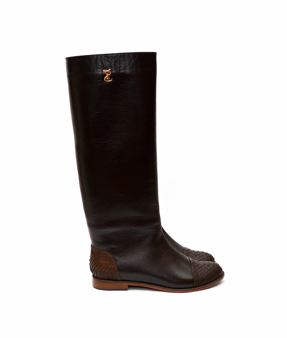 Mueller Brown Suede – Riding boots made of genuine suede leather. This high quality pair of knee boots is designed in a simple and versatile style with python leather toe and heel detailing. A perfect model for your day to day.