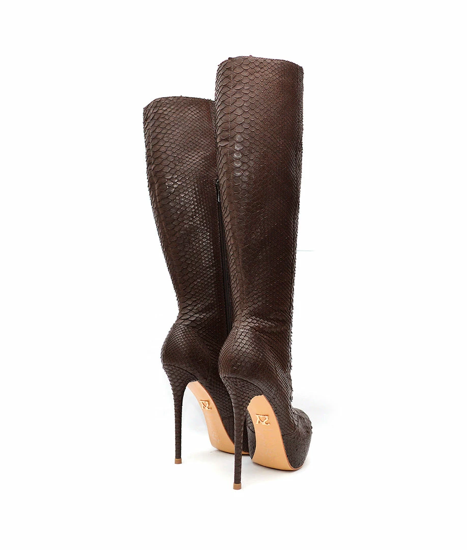 Okea Brown Python – Platform boots with a simple design and a very high heel in Python Leather. Choose your preferred sole color and heel height.