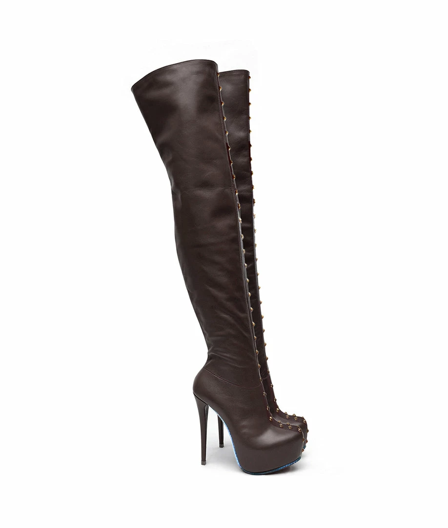 Tackies Brown is a model of platform boots with a wide heel with a very sensual and striking design. In the front of the boot runs a fine studs making the legs seem infinite. The type of material used for this model is Strech leather for a better fit to the leg. Customize your model by choosing the heel height or the sole color..
