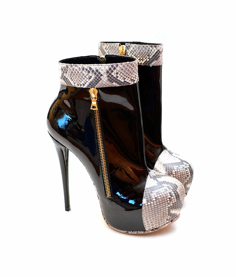 Tormenta Black Patent is a high heel platform ankle boot model that has been designed mixing textures. At the toe and around the ankle in python leather. A different and original model that you can customize by choosing the color of the sole or the heel height.
