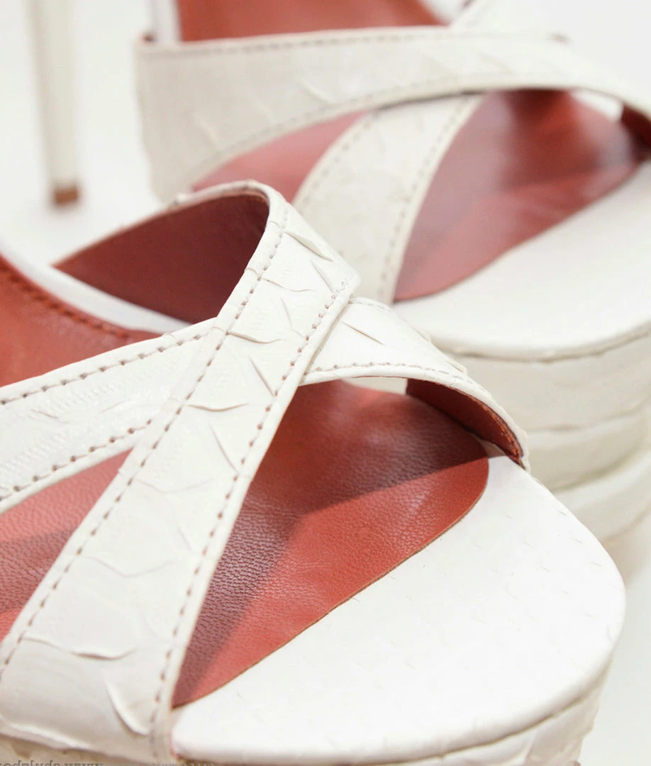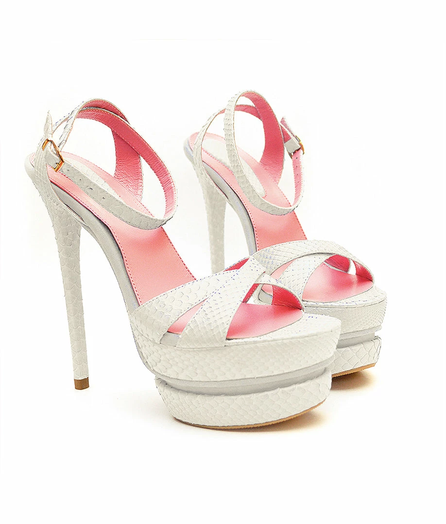 Calea White Python, Beautiful sandals design crafted from real python leather in black color. This pair of sandals is designed with double platform, fine ankle straps and high heel. Original and elegant model with versatile style perfect for any events.