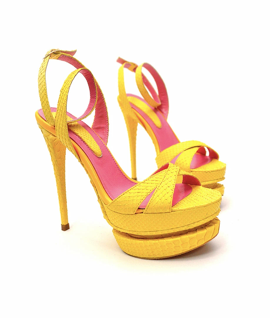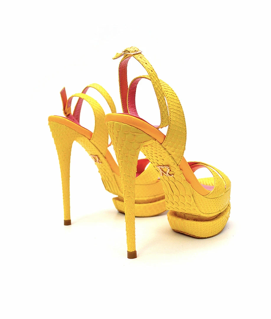 Calea Yellow Python, Beautiful sandals design crafted from real python leather in black color. This pair of sandals is designed with double platform, fine ankle straps and high heel. Original and elegant model with versatile style perfect for any events.