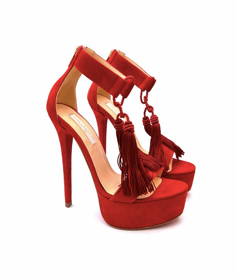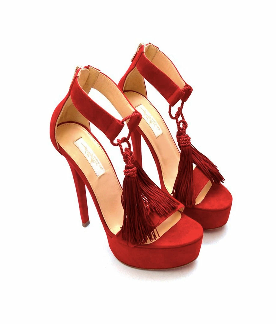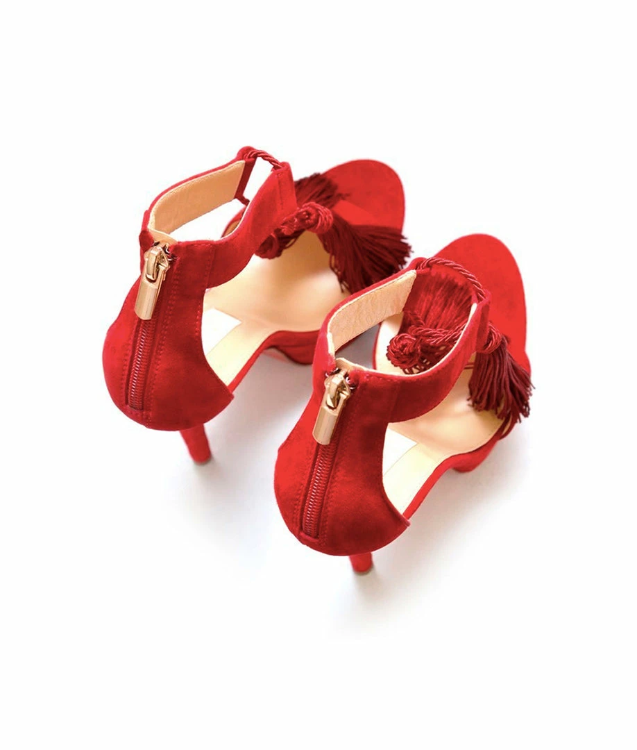 Dynkia Red Suede – This pair of sandals has a stylish and moving design. Its design has two straps, one on the fingers and the other holding the ankle. On the ankle bracelet as an ornament it has two tassels that move sinuously with each step. Rhythm and elegance.