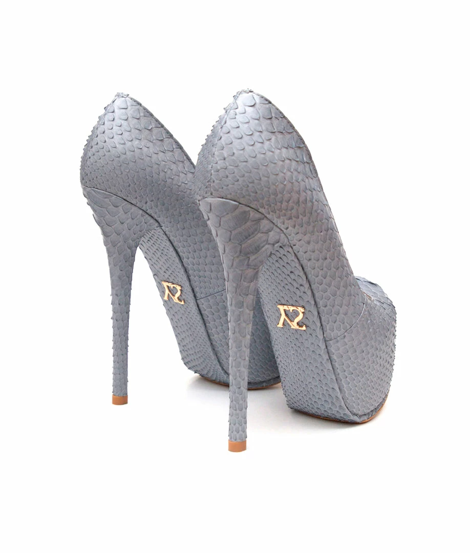 Junna Gray Python · Exclusive model crafted from real python leather. If you are a truly high heels lover this pair of shoes is made for you. One piece made with high quality materials that will capture all glances in every step you take