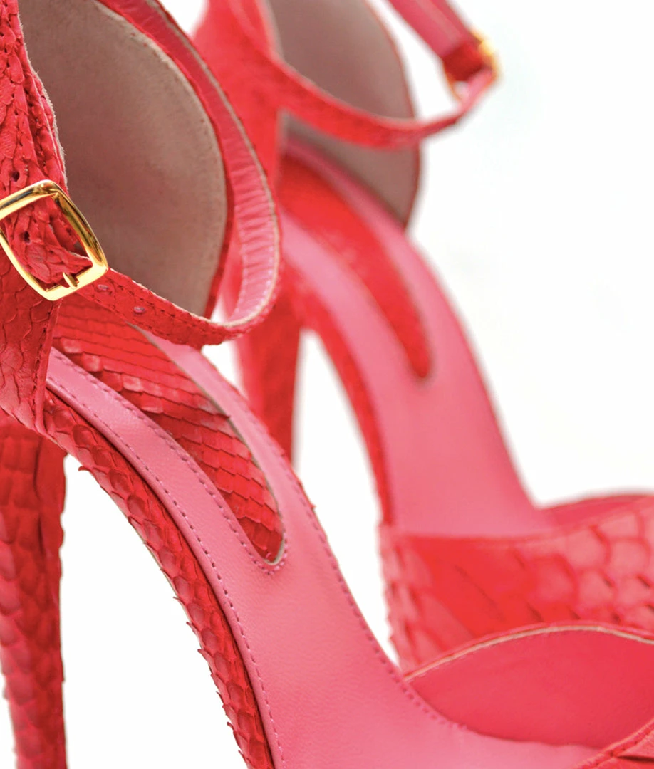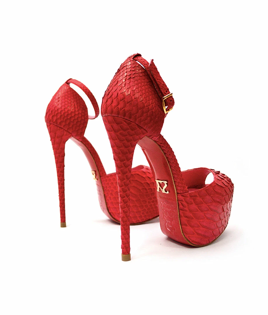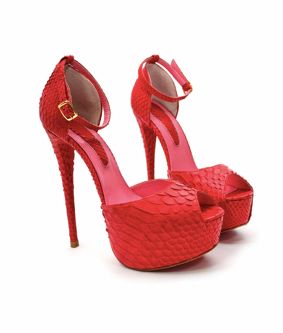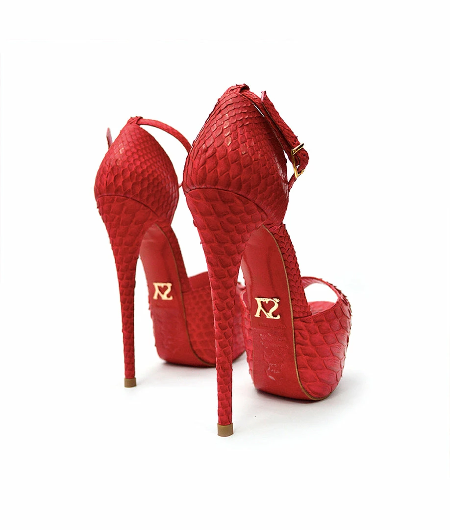 Tycas Red Python, It is a model of platform sandals with a very high heel. The peep toe and ankle strap model has an elegant and stylish design. Choose your ideal color and height..