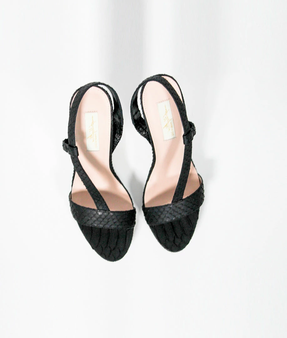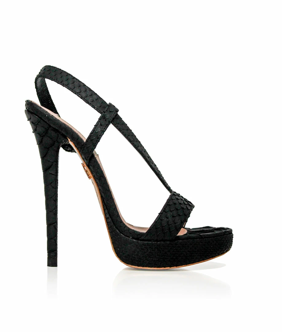 Siama Black, Beautiful sandals design crafted from real python leather in black color. This pair of sandals is designed with double platform, fine ankle straps and high heel. Original and elegant model with versatile style perfect for any events. These sandals are decorated with a fur rabbit pompom.